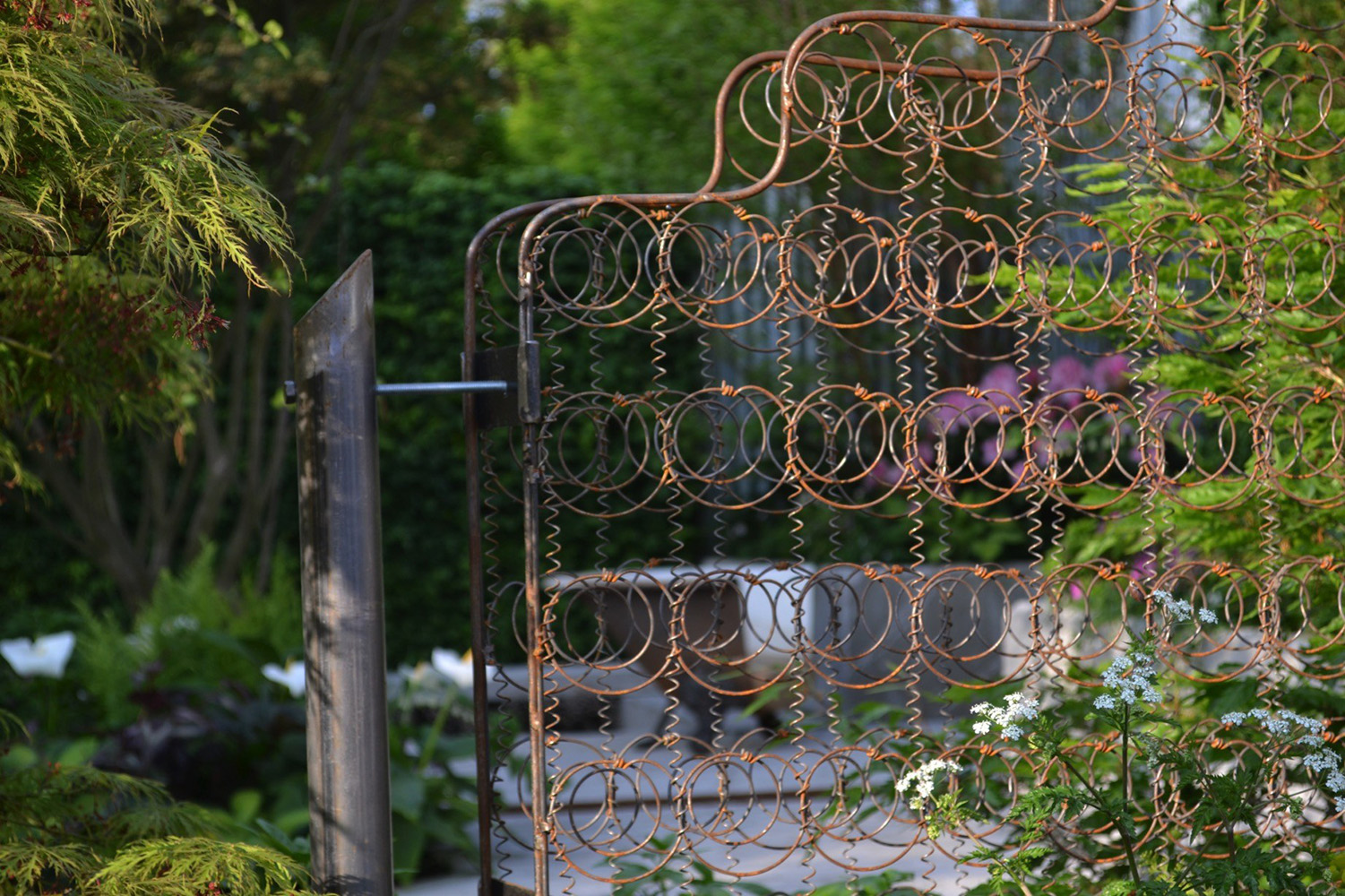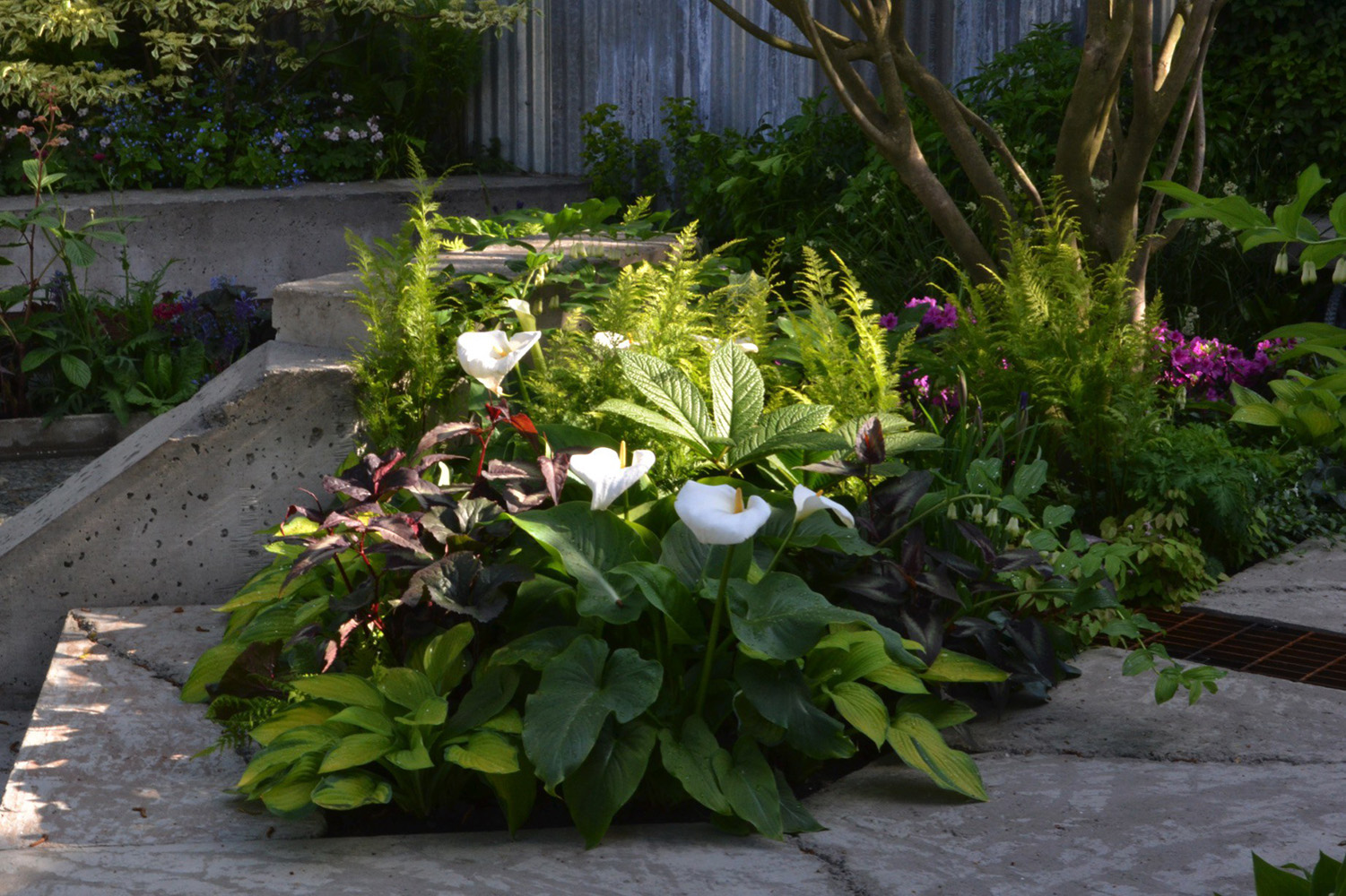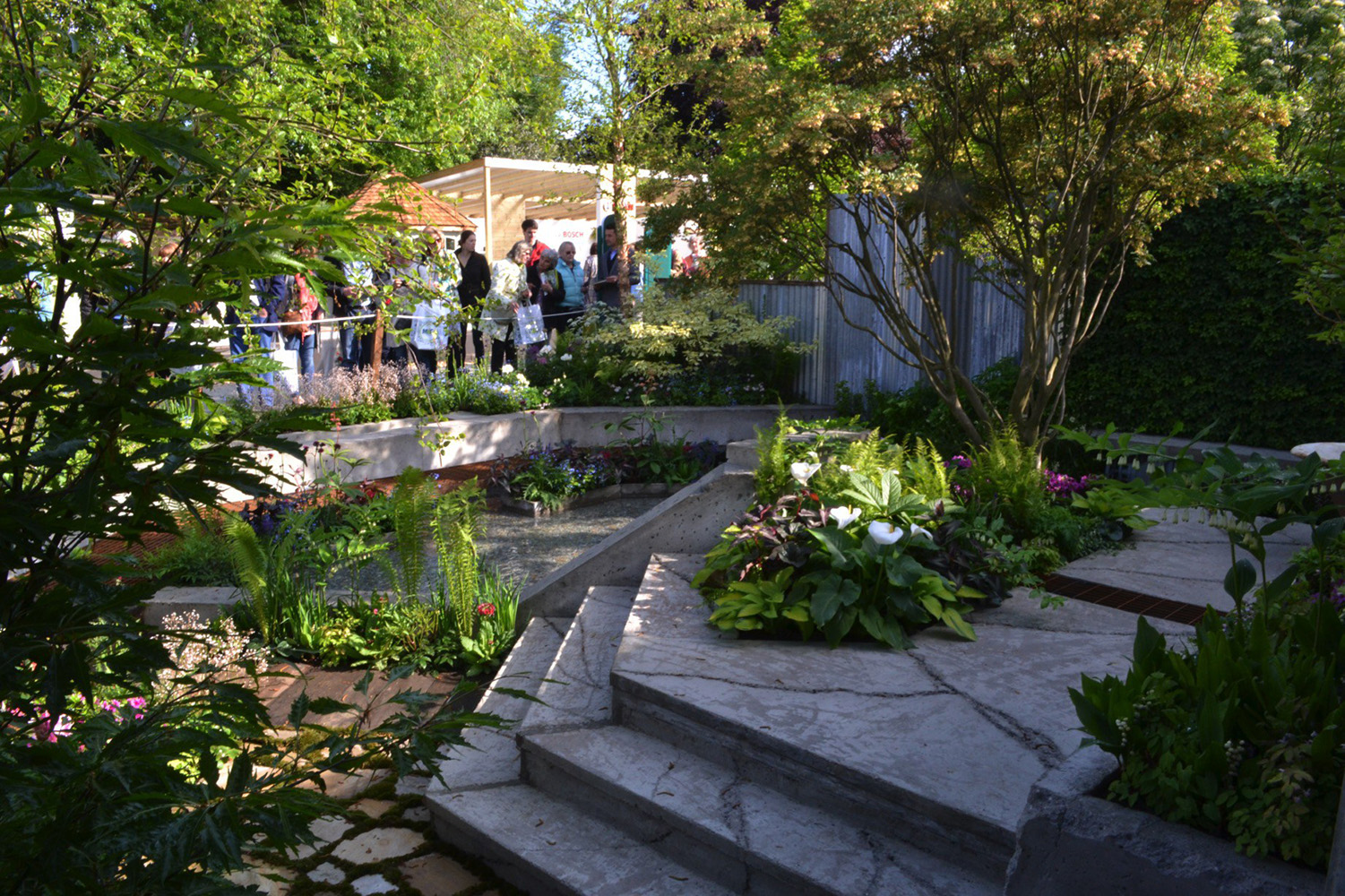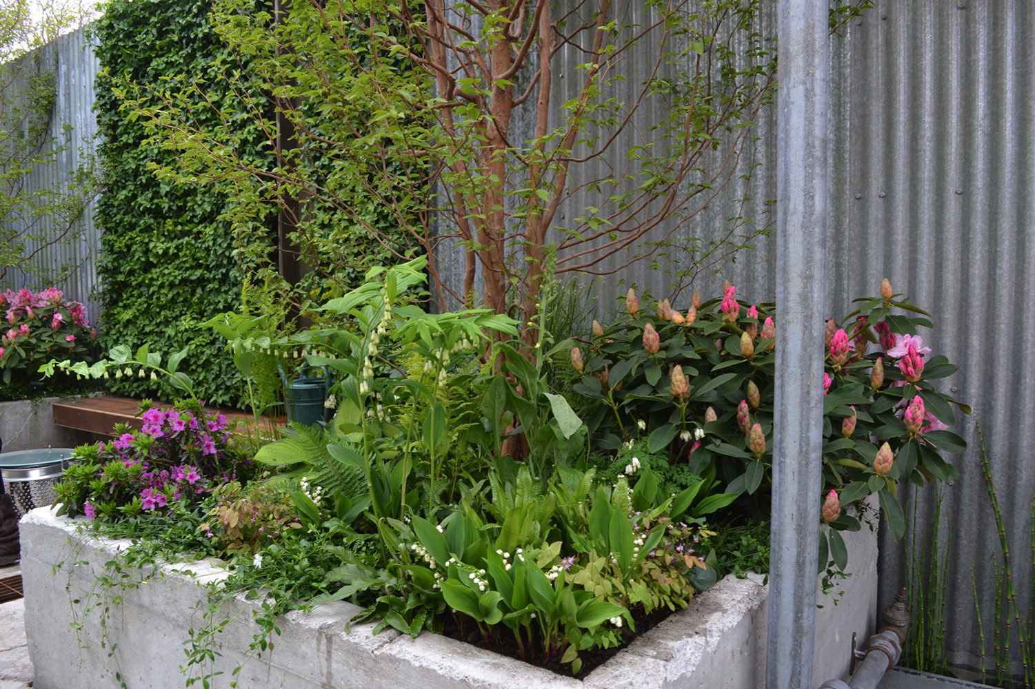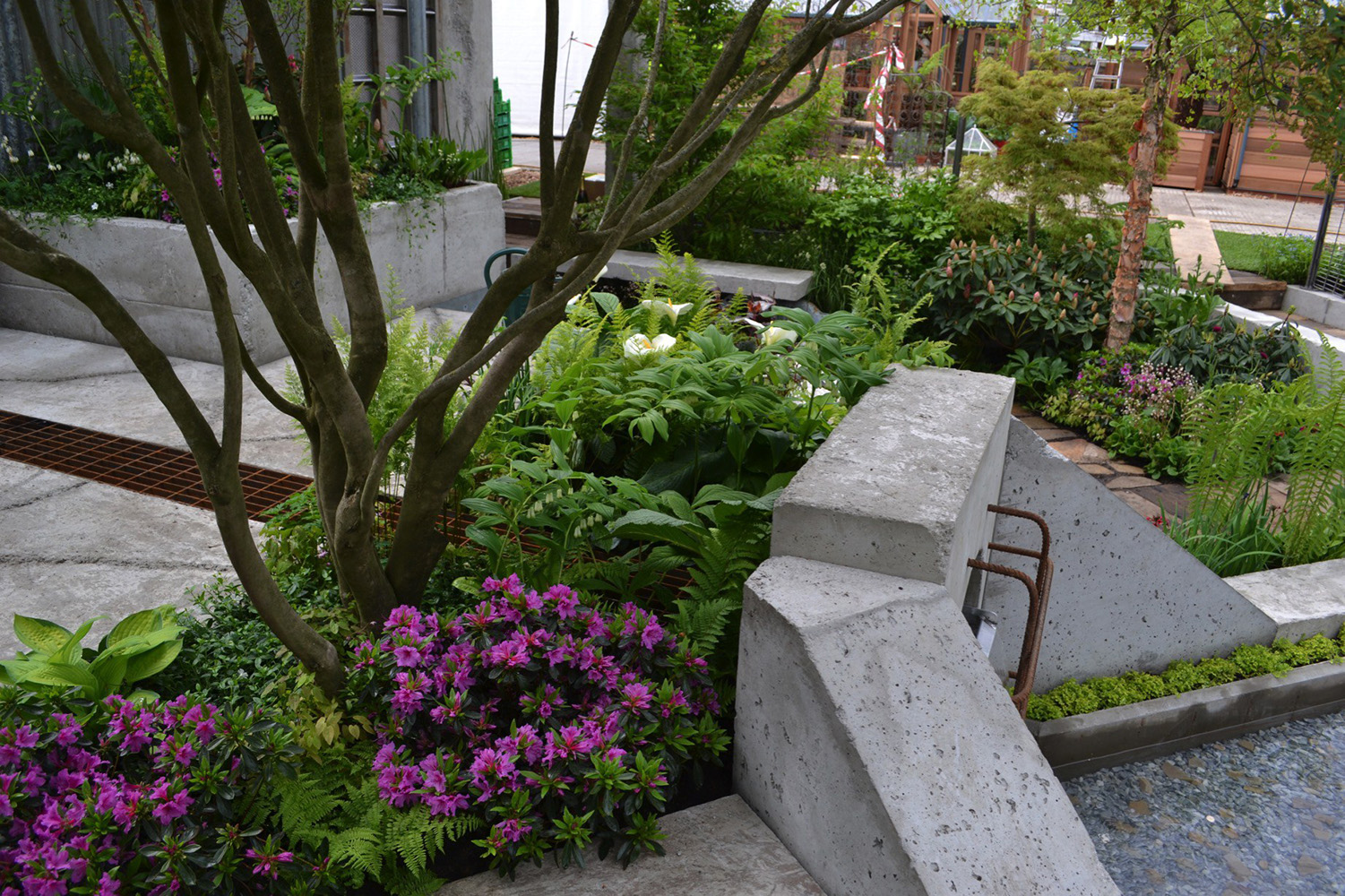There is always a temptation to only showcase the new and shiny at Chelsea, but repurposed items can be beautiful too. This garden made us look at things differently and has continued to enforce the way we work to this day seven years later. What made the garden shine around these rough and ready structures and elements was the plating. Trees cast shade and the rest of the planting was in tune with this. Thinking about how a community could garden a space effectively when perhaps they were time poor because of jobs and family commitments enforced the decision to use shrubs. Often not used at Chelsea; they can be tricky as once they have flowered so unlike perennials which are easier to hold back or push forward they can be a little nerve-wracking to get exactly right for a specific week in May. A semi-shaded site and a May timeline works for Rhododendron, Azalea and Enkianthus perfectly though. There were also Choisya and varieties of Cornus as well as Betula nigra with their wonderfully shaggy bark and Stewartia with their rosy smooth. All easy care and all completely viable and believable in the setting. In reality they would form a strong backbone to the scheme and make the garden enticing all year round. An important factor when creating a garden that only lasts a week for people to take ideas away from to try out in their own gardens.