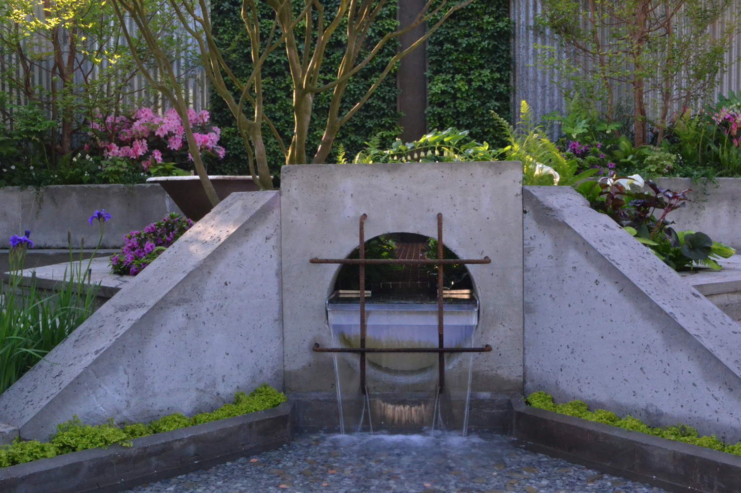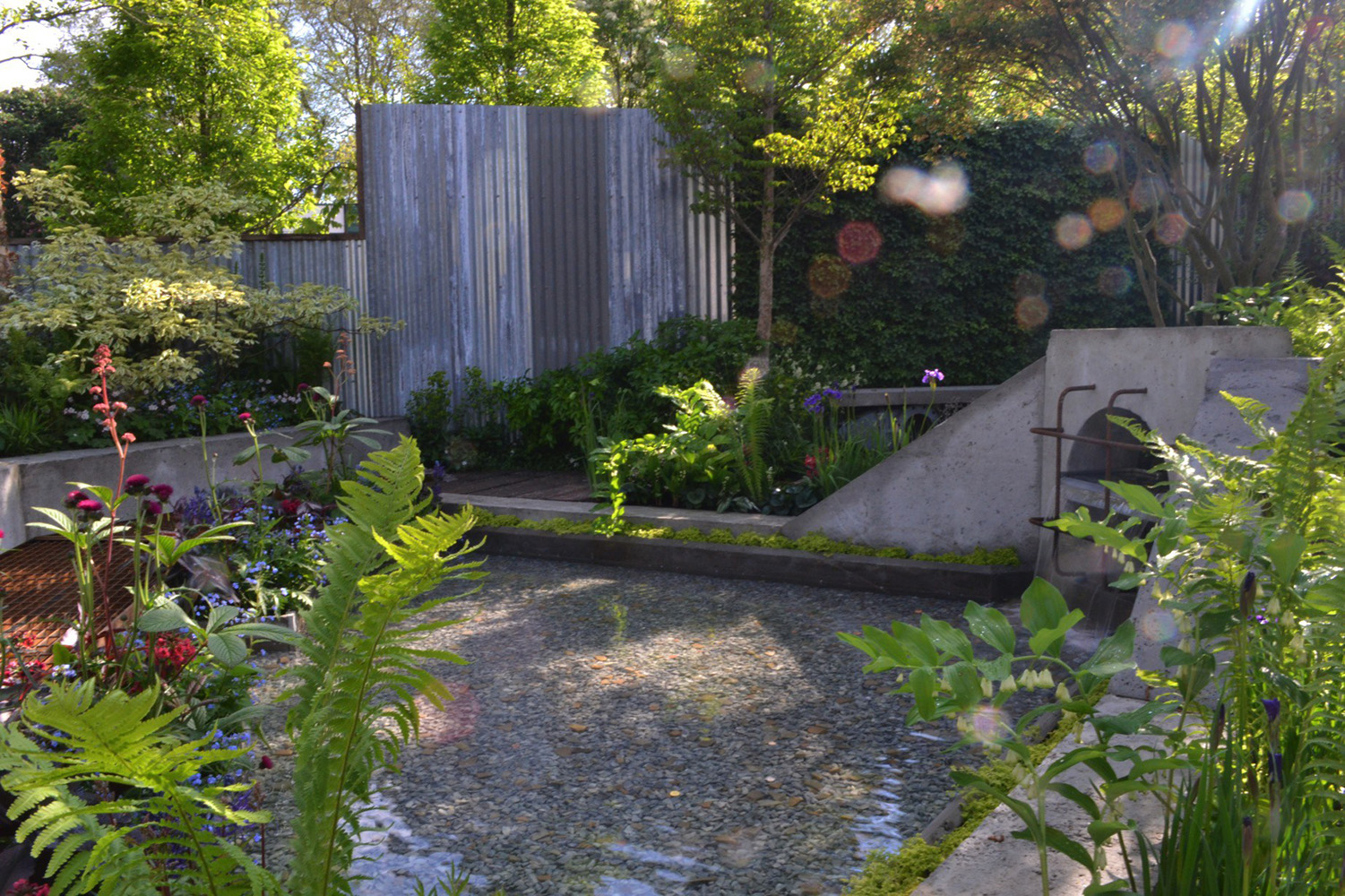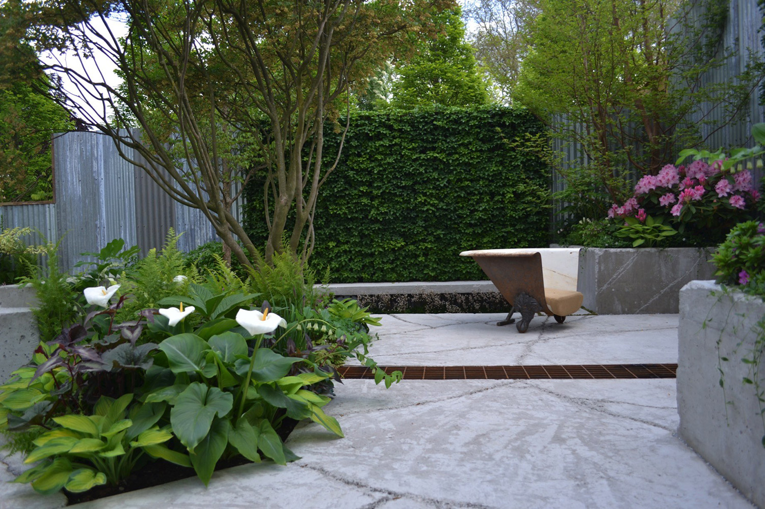 The Wasteland was inspired by Kate’s personal experiences working in and around London where there are so many areas that could be greened if more thought was given to them. Designed as a community space it was imagined on an abandoned industrial site where existing old, but reusable infrastructure was planted around to create a community space that could be easily gardened. Items assumed to have been left on the site such as mattresses, washing machine drums, baths and shopping trolleys were repurposed as screens, water features and seats. Rusty galvanised sheeting was erected as a boundary treatment, whilst the paving was crazy (both literally and metaphorically as time slipped away and the birds picked the moss out of the joints on more than one occasion overnight). The original concept for the garden came from an image of a storm drain and although there was no way to use a real one in the garden it was possible to make one and make it look old and once that decision was made then the rest of the concrete elements which made up steps and walls had to go through the same laborious process.